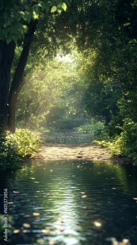 Walking Path Through Lush Green Forest with Tranquil Stream