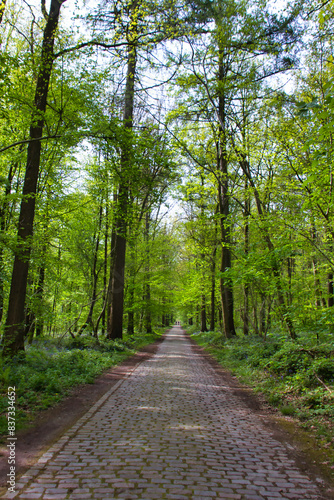 Walking pathway in the middle of the forest in spring, with high beech trees on the two sides and a vanishing point