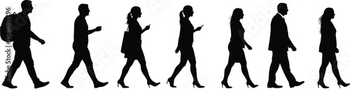 Walking people silhouette, business and casual, urban pedestrians vector, male and female figures, walking pose, people side view, daily routine movement, commute design