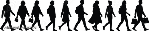 Walking people silhouette collection showing men and women commuters with bags backpacks urban lifestyle motion isolated black figures set