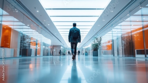 Walking through a modern corporate hallway office building photography contemporary setting perspective professionalism