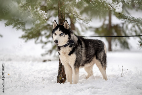 Walking with your pet husky in the park in winter. Friendship with a dog. Breeding and keeping a husky dog.