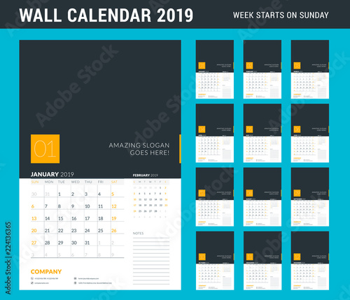 Wall calendar planner template for 2019 year. Set of 12 months. Week starts on Sunday. Vector illustration