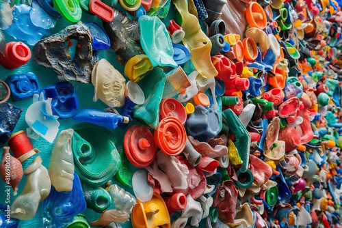 Wall mosaic made of colorful plastic caps and waste highlights recycling and waste management