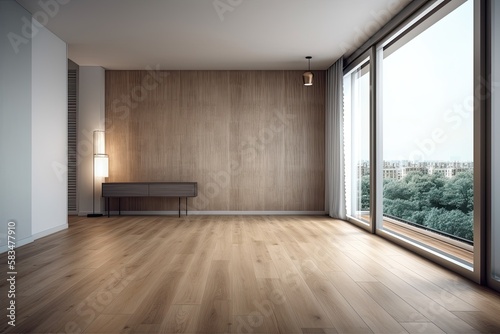 Wall mounted canvas in rooms with bollards, parquet wood flooring, an empty wall, and an unfurnished apartment room. planning a design. Generative AI