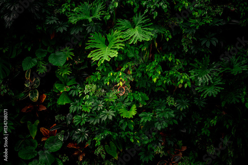 Wall of vibrant plants with deep shadows. Biodiversity collection.