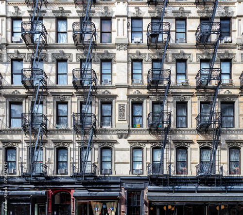 Wall of windows on an old apartment building in the Lower East Side neighborhood of Manhattan, New York City