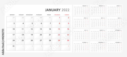 Wall quarterly calendar template for 2022 in a classic minimalist style. Week starts on Monday. Ready to print