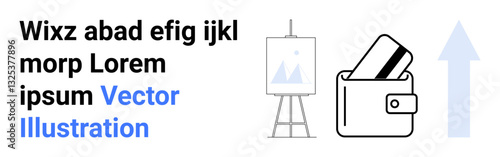Wallet with credit card, upward arrow, and easel with artwork. Ideal for finance, banking, investment, business growth, creativity art portfolio. Landing page