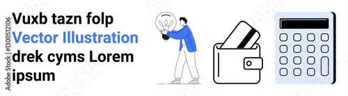 Wallet with credit cards, person holding light bulb and phone, gray calculator. Ideal for finance, innovation, technology, payments, budgeting investments mobile apps. Landing page