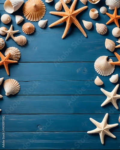 Wallpaper - beach scene concept with sea shells and starfish on a blue wooden background