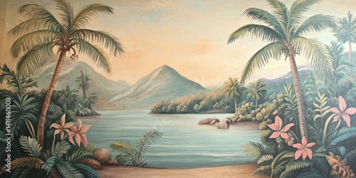 Wallpaper serene tropical landscape painting in pastel tones
