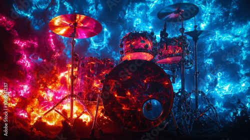 Wallpaper Showcasing A Drum Kit With Colorful Light Beams And Abstract Designs Swirling Around, Embodying The Rhythm And Excitement Of Live Rock Music Background