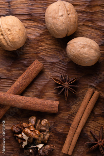 Walnuts, cinnamon and star anise on wooden cutting board. Nuts and spices on the table. Food composition.