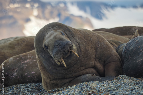 Walrus colony herd on the sand beach. Detail portrait of Walrus with big white tusk, Odobenus rosmarus, big animal in nature habitat on Svalbard, Norway.