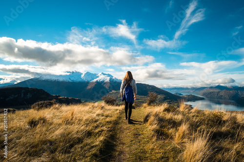 Wanaka. Roys Peak Track, South Island, New Zealand. A hiker hiking on the beautiful track with a landscape of the mountains and Lake.