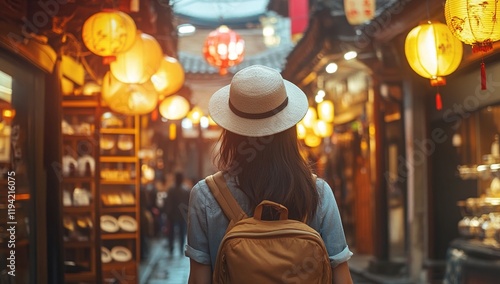 Wanderer Explores Vibrant Night Market with Glowing Lanterns and Unique Shops, Immersive Travel Experience.