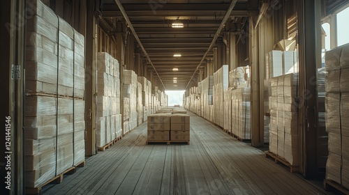 Warehouse aisle, cardboard boxes stacked, shipping, logistics, industrial interior, sunlight