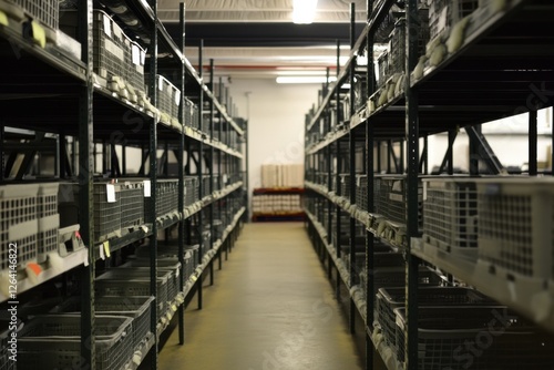 Warehouse Aisle with Metal Shelves and Empty Storage Baskets