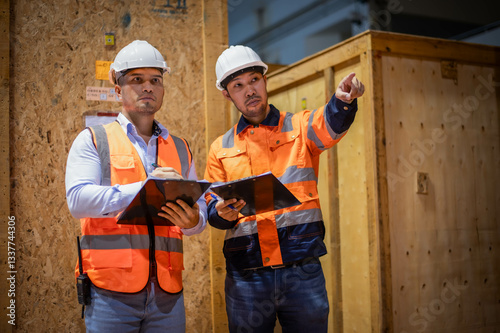 Warehouse inspectors and factory architects are having a meeting to discuss the layout of goods to meet the company's standards.