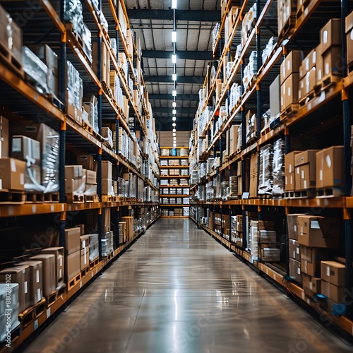 Warehouse Interior - Rows of Shelves and Cardboard Boxes