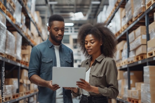 Warehouse manager talking. checking product in warehouse, Logistic industry concept. warehouse. employees. delivery and dispatch of goods and parcels. checking the necessary goods in the warehouse