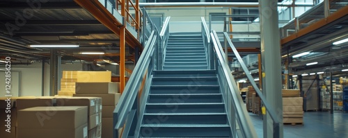 Warehouse metal stairs ascending, boxes stacked, mezzanine level