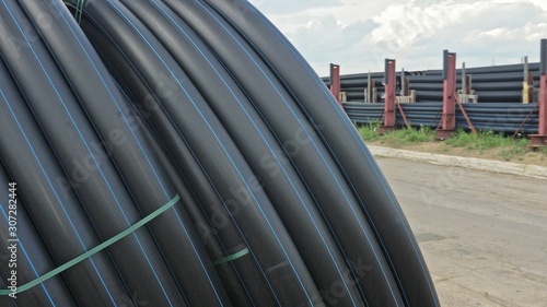 Warehouse of finished plastic pipes industrial outdoors storage site. Manufacture of plastic water pipes factory. Process of making plastic tubes on the machine tool with the use of water and air