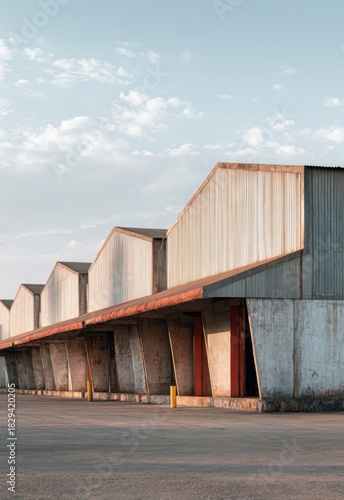 Warehouse Structure Under the Sky: A stark, industrial warehouse building with a unique angled roofline and loading dock area dominates the scene. The image captures the structure against a bright.