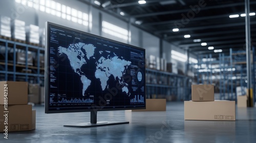 Warehouse tech screen displays global inventory data. Modern software interface shows global distribution network. Boxes, tech equipment seen in warehouse setting. Digital analysis, monitoring tools