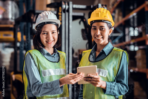 Warehouse woman wearing a hardhat standing cargo at goods or merchandise warehouse and check for control loading from Cargo freight ship for import and export by report on tablet. Teamwork concept