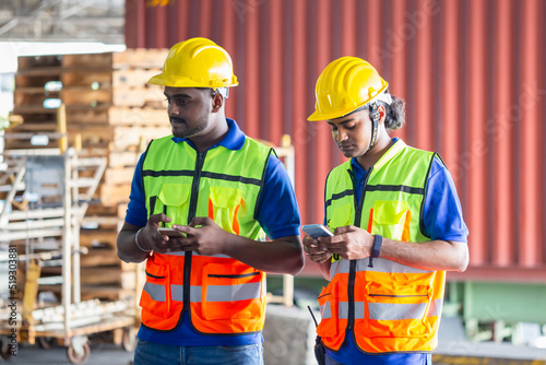 Warehouse worker in the hard hat uses mobile phone, Men using smartphone