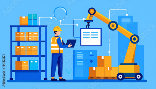 Warehouse worker managing automated robotic arm for logistics. A worker oversees the robotic arm in a warehouse, managing boxes and inventory with technology