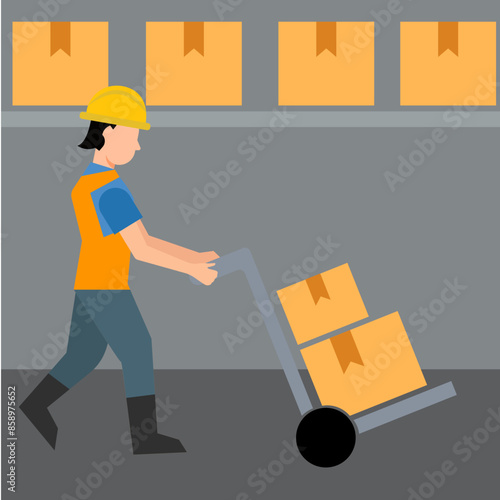 Warehouse worker pushing hand truck with boxes vector flat design illustration.