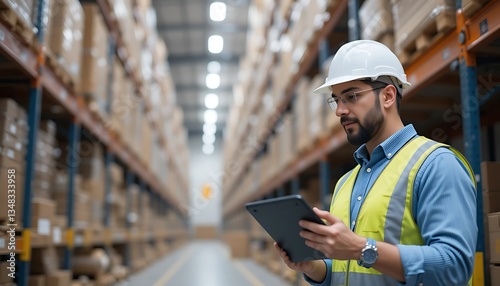 Warehouse Worker Using Tablet for Inventory Management Inside Industrial Storage
