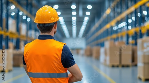warehouse worker wearing safety vest and helmet observes organized shelves and boxes in large, well lit warehouse