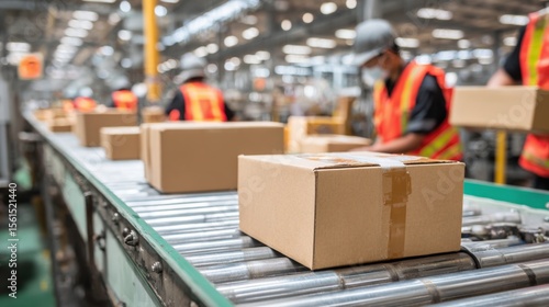 Warehouse Workers Handling Packing and Sorting Boxes in Modern Logistics Facility.