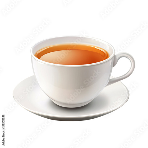 Warm amber tea in a pristine white cup and saucer; calming, inviting mood; perfect for breakfast, relaxation, or tea time imagery.