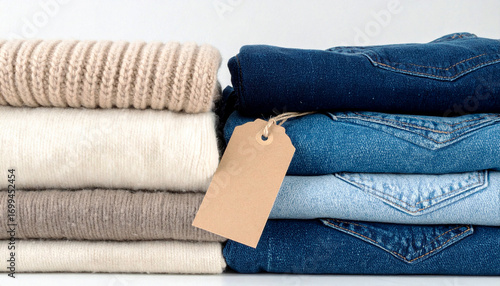 Warm and Cozy Clothing Stack with Knitted Sweaters and Denim Jeans