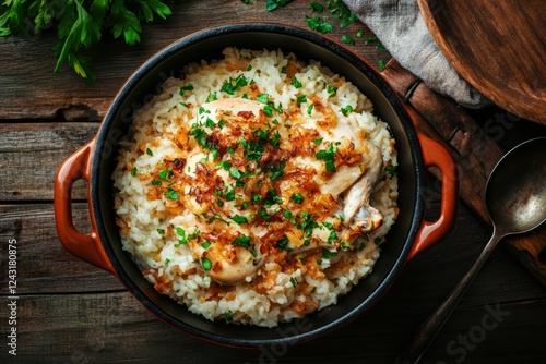 Warm and hearty dish of chicken and rice baked in a rustic Dutch oven. The savory meal is presented in a cast iron pot, radiating comfort and homemade charm.