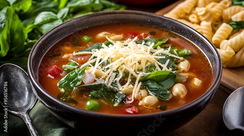 Warm and hearty minestrone soup garnished with fresh basil and grated cheese