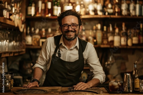 Warm and inviting atmosphere of a dimly lit pub with a friendly 40-year-old bartender behind the bar, perfect for casual gatherings and laid-back evenings
