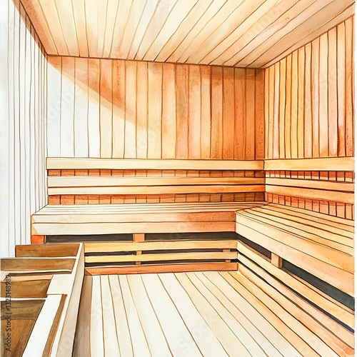 Warm and inviting sauna interior a detailed watercolor illustration of a relaxing spa setting.