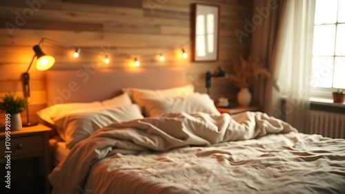 Warm and peaceful bedroom scene, featuring soft blankets and diffused natural light for a cozy feel.
