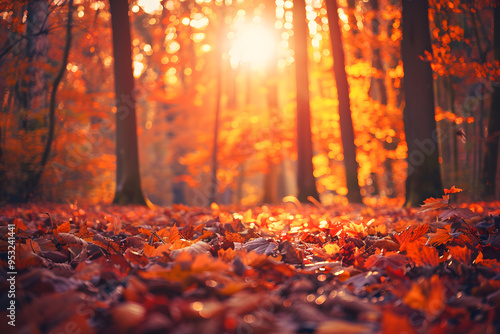 Warm and vibrant fall background with a forest of trees showcasing rich autumn colors and a serene atmosphere