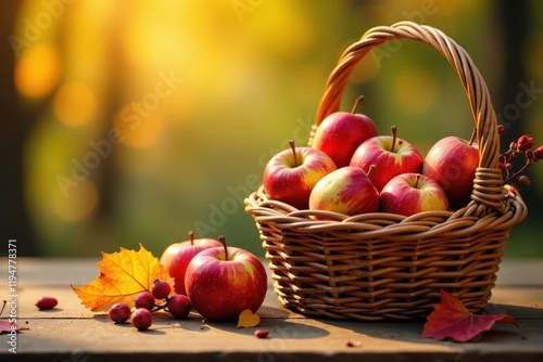 Warm autumn light, woven basket, apples, pears, dried flowers, empty space , image, organic, light
