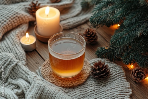 Warm beverage in glass mug on knitted surface, surrounded by candles and pine cones. Cozy winter scene perfect for blogs, websites, or greeting cards, evoking feelings of warmth and comfort.