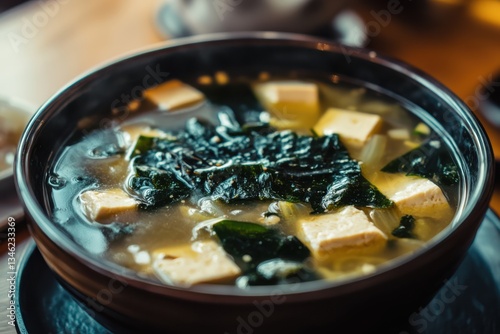Warm bowl of miso soup with tofu and seaweed enjoyed on a cozy afternoon in a local eatery