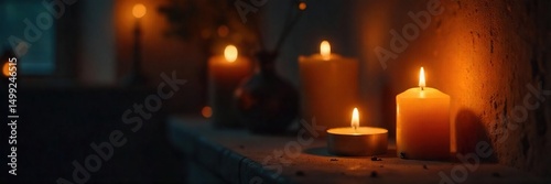 Warm candlelight illuminates a dark room, creating a cozy and intimate atmosphere Soft glow, flickering flames, shadows dance on the wall, creating a sense of peace and tranquility , dark, mood