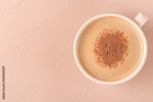 Warm coffee cup with intricate cocoa design atop creamy surface,